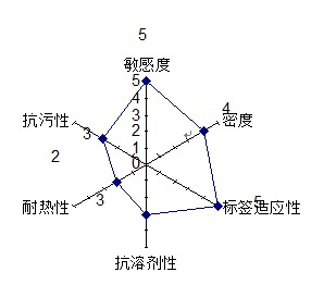 下圖代表了B112打印在涂布紙吊牌和標(biāo)簽的特別應(yīng)用。性能等級(jí)基于混合基色帶的對(duì)照。級(jí)別1到5,5級(jí)最好。