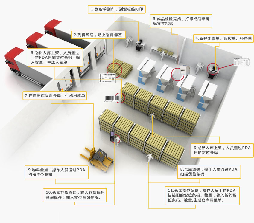 1.采用無線PDA條碼數據采集器作業,所有條碼作業脫離電腦鼠標,直接在現場進行入庫、出庫、盤點、調撥、退補貨等倉庫作業。